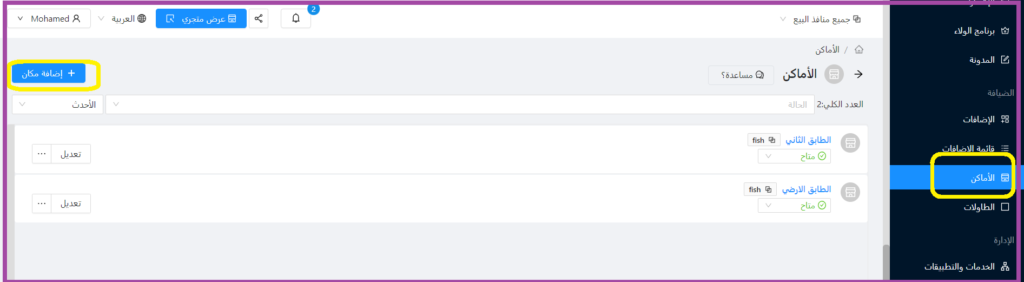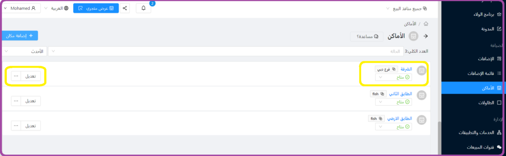 3-ستظهر قائمة الأماكن مرة أخرى وبها المكان الجديد الذي عرفته , لاحظ يمكنك تغيير حالة المكان او تعديل بياناته.