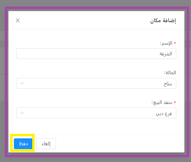 2 – اختر إضافة مكان ===> ستظهر شاشة اضافة مكان ادخل البيانات وعين منفذ البيع التابعة له المنطقة أو المكان , ثم اضغط حفظ.