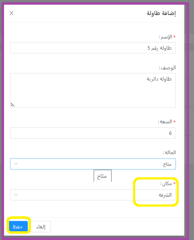 2 – اختر اضافة طاولة ===> ستظهر شاشة بيانات طاولة ===> أدخل البيانات , اختر المكان التابعة له الطاولة , ثم اضغط حفظ. ستظهر قائمة الطاولات وبها الطاولة التي عرفتها.