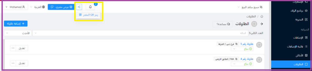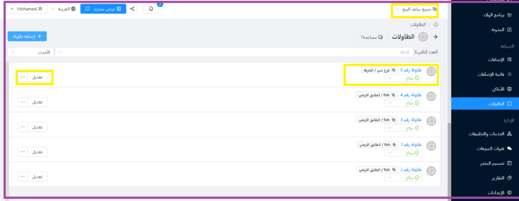 3- من قائمة الطاولات , يمكنك تفعيل او الغاء تفعيل اي طاولة , تعديل بيانات طاولة.