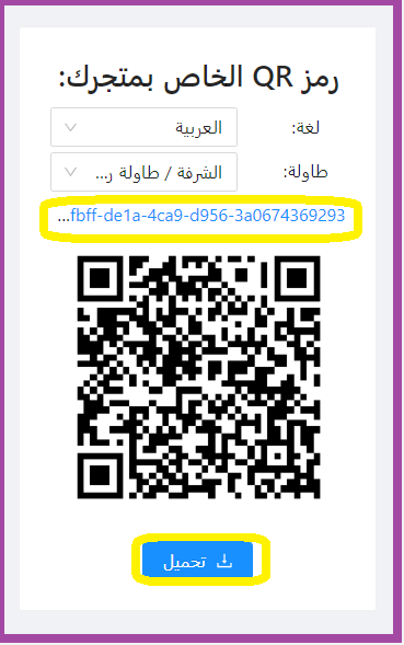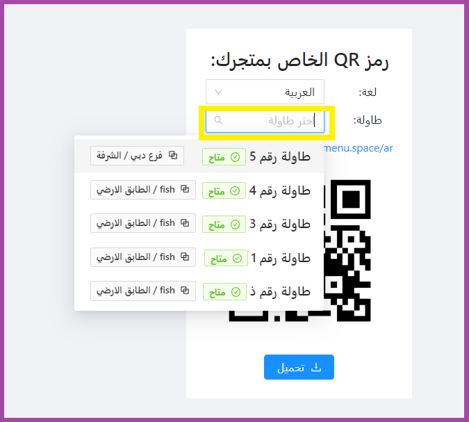 اختر اللغة و رقم الطاولة , سيظهر رابط الطاولة و صورة QR الخاص بها .