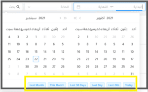 يمكنك تحديد تاريخ الطلب من – الى أو الاختيار من التواريخ المعدة مسبقا لفلتر تاريخ الطلب , طلبات اليوم , أو آخر 24 ساعة ,أو اليوم الماضي, أو آخر 30 يوم , أو طلبات هذا الشهر, أو طلبات الشهر الماضي .